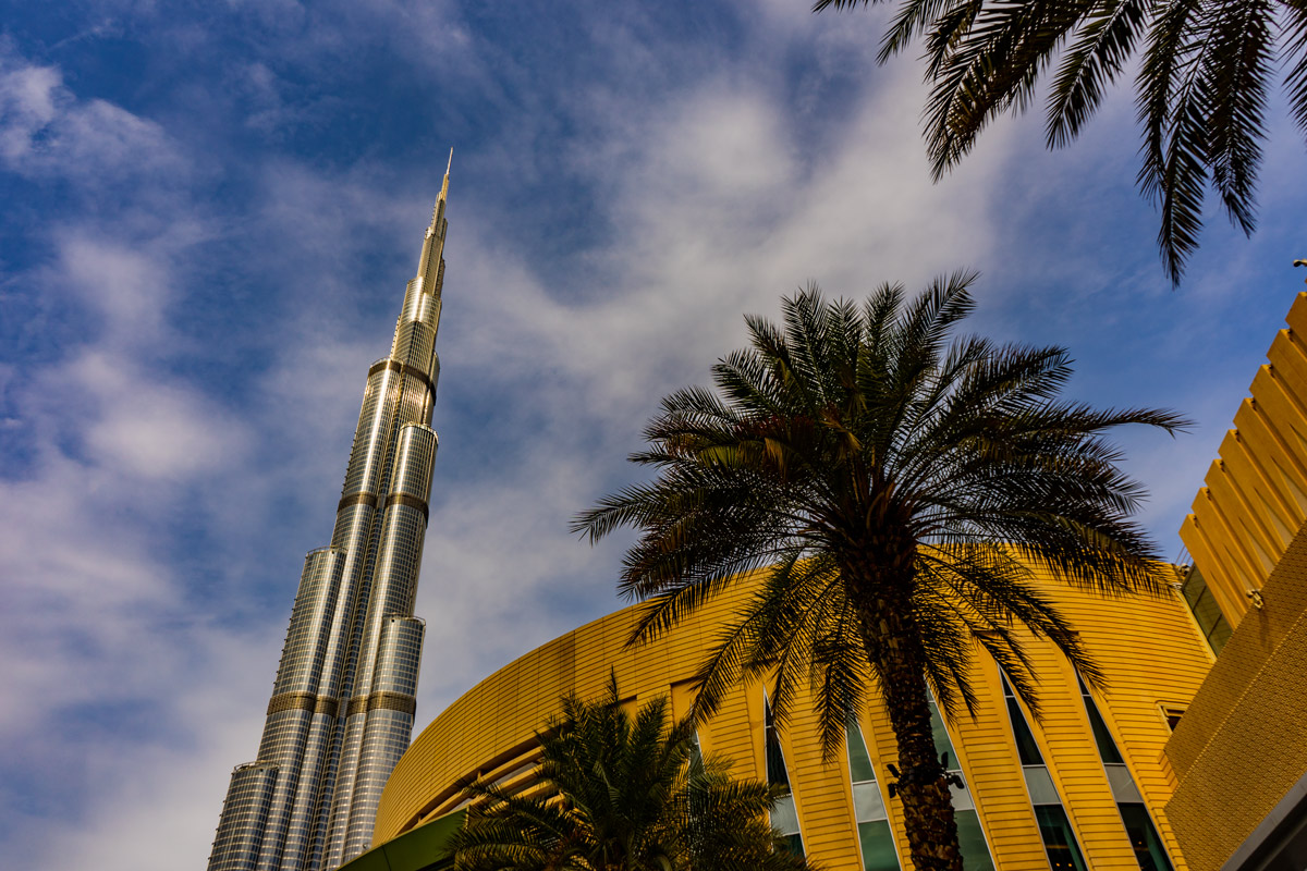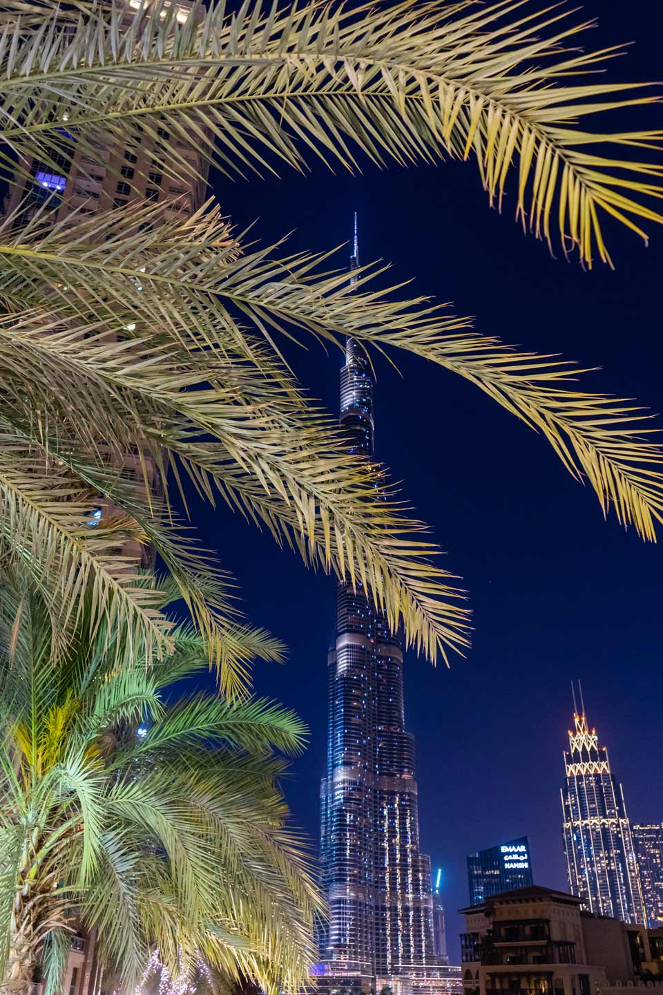 Downtown Dubai: Burj Khalifa behind a palm tree